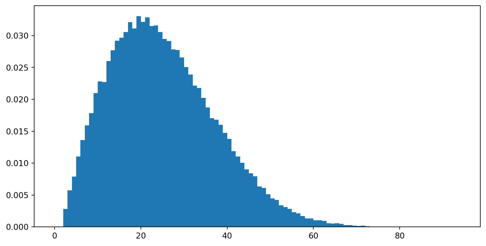 from random import choicefrom statistics import meanimport matplotlib.pyplot as pltdays =range(365)def same_birthday_size(): bdays =set()while (chosen := choice(days)) notin bdays: bdays.add(chosen)returnlen(bdays) +1sizes = [same_birthday_size() for _ inrange(100000)]plt.hist(sizes, bins=range(max(sizes)), density=True)plt.show()print("Mean is", mean(sizes))