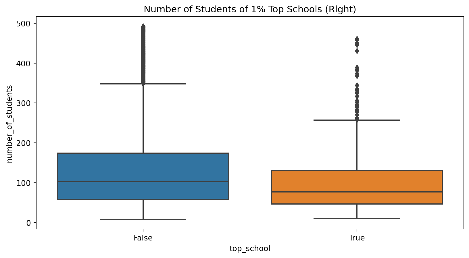 import numpy as npimport seaborn as snsplot_data = (df.assign(top_school = df["avg_score"] >= np.quantile(df["avg_score"], .99))[["top_school", "number_of_students"]].query(f"number_of_students<{np.quantile(df['number_of_students'], .98)}")) # remove outlierssns.boxplot(x="top_school", y="number_of_students", data=plot_data)plt.title("Number of Students of 1% Top Schools (Right)");