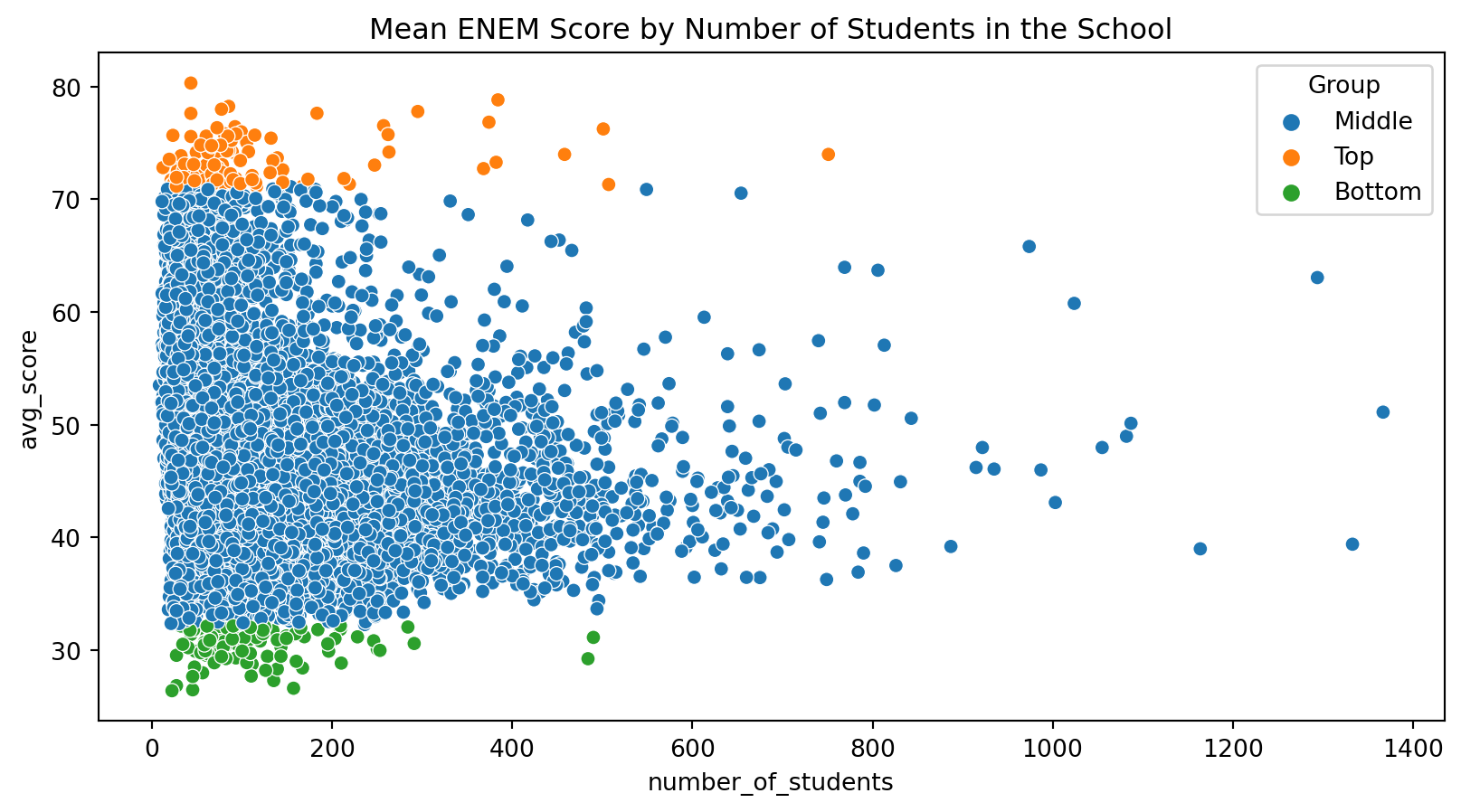q_99 = np.quantile(df["avg_score"], .99)q_01 = np.quantile(df["avg_score"], .01)groups =lambda d: np.select([d["avg_score"] > q_99, d["avg_score"] < q_01], ["Top", "Bottom"], "Middle")plot_data = df.sample(10000).assign(Group = groups)sns.scatterplot(y="avg_score", x="number_of_students", hue="Group", data=plot_data)plt.title("Mean ENEM Score by Number of Students in the School");